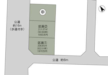 道路 北西側 公道 約16m、南西側 公道 約6m、隅切り部分(約5m)あり